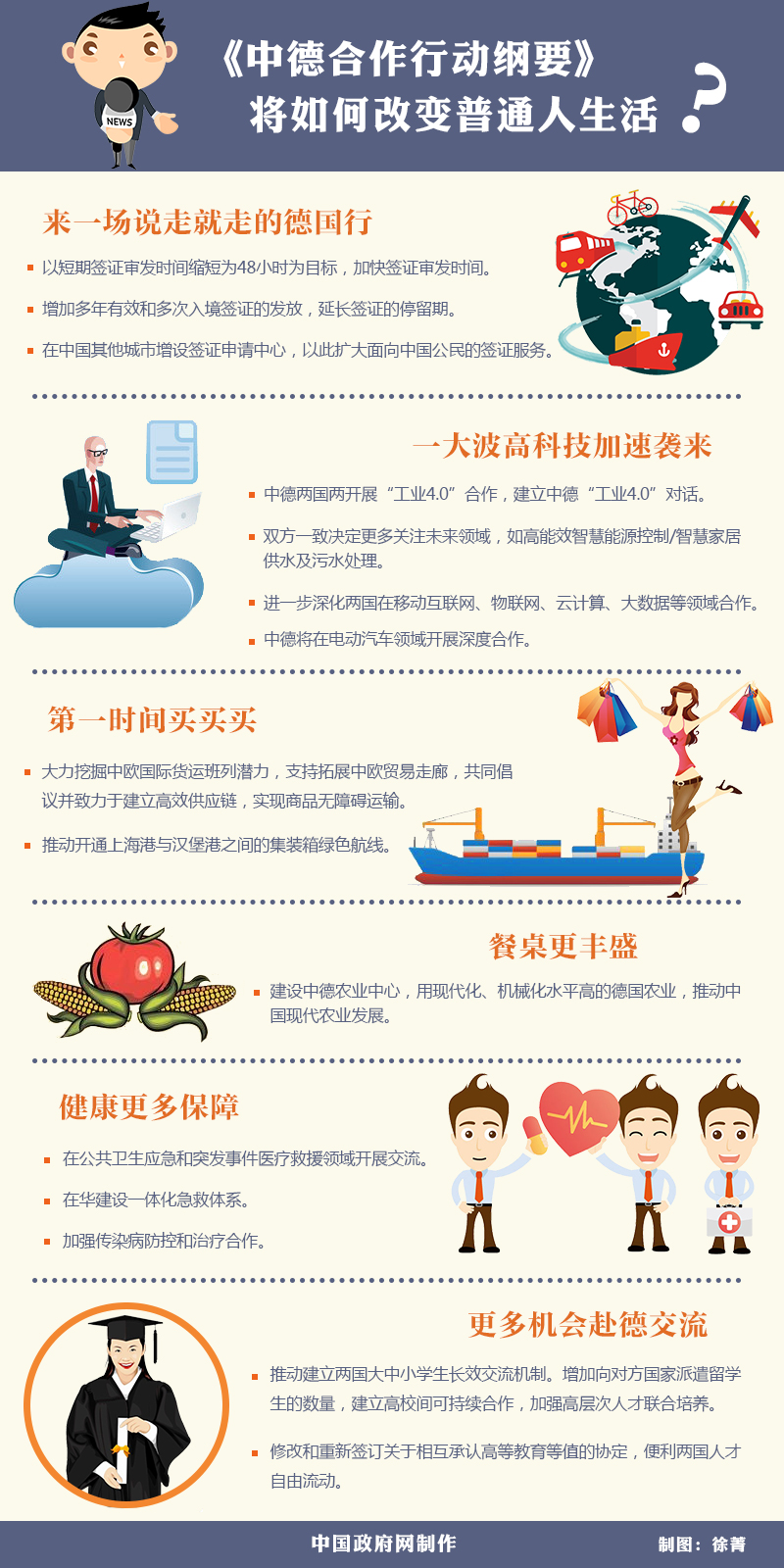 纲要全文如下: 中德合作行动纲要:共塑创新 2014年10月10日,中华人民共和国国务院总理李克强在柏林同德意志联邦共和国总理安格拉·默克尔共同主持第三轮中德政府磋商。磋商在十分友好、合作的气氛中举行。双方决定发表《中德合作行动纲要:共塑创新》,此系2014年3月中国国家主席习近平对德国成功进行国事访问时与默克尔总理达成的共识。 双方认为,近年来,两国互访频繁,合作更趋紧密,中德关系中各层面的交流得到深化。双方坚信,全方位战略伙伴关系将有助于增强政治互信和互利。双方认为,在这一框架下建立的中德创新伙伴关系具有全面性和可持续性, 涵盖各个合作领域。中德两国互为在各自地区最重要的合作伙伴,愿本着平等、互尊、互利的伙伴精神继续拓展双边关系,这也有利于国际合作。创新伙伴关系在此 发挥重要作用。 双方一致认为,政府磋商机制和高层互访对继续发展双边关系、贯彻中德合作行动纲要具有指导意义。行动纲要应适时进行复核和修订。此纲要符合《中欧合作2020战略规划》精神,两者相互促进,并有利于建设中欧和平、增长、改革、文明四大伙伴关系。 一、平等互信:更紧密的政治合作与共同责任 中德两国视对方为战略伙伴,对世界和平、稳定与繁荣共同承担重要责任。两国商定,加强双边、中欧框架内和国际组织中的合作,并愿为国际热点问题 寻求创新的可持续解决方案。鉴此,双方将继续加强协调,特别是外交与安全战略对话框架下的协调。双方致力于按照《联合国宪章》确立的国际法和平解决地区和 国际争端和冲突。中德两国高度重视进一步深化中欧战略伙伴关系,欢迎双方加强政治对话。双方愿在平等和相互尊重基础上,继续开展在安全政策领域和在法治国 家建设等法律领域的成功合作。 政治合作 1.认为两国高层保持经常接触对促进两国关系至关重要,同意继续保持高层互访频繁势头,利用双边互访及多边场合、热线通话等方式保持两国领导人间的经常性沟通。 2.强调2010年商定建立的定期政府磋商机制对促进两国合作具有核心协调作用,应原则上每两年举行一次。两国外交部是协调单位。双方将以此为引领,不断夯实由60多个政府间经常性对话机制构成的广泛合作基础,使政治对话与全面合作有机结合。 3.商定于2015年上半年启动由两国外长主持、国防部代表参加的中德外交与安全战略对话,每年举行一次,以此加强两国在外交和安全政策问题上的协调。 4.定期举行两国外交部副外长/国务秘书级政治磋商以及司局级外交政策规划、军控、领事、网络安全等分领域磋商交流。双方将就重大双边、地区和国际事务保持直接沟通。 5.重视并组织好两国外交官特别是青年外交官之间的交流互访活动,继续拓展两国外交部间的联络和关系。 6.支持继续深化两国人员互访,将本着对等互惠原则在现行法律框架内为便利人员往来创造最佳条件。双方在对等基础上以将短期签证审发时间缩短为 48小时为目标,通过简化签证申请程序,加快签证审发时间,实施便利申请人的签证审发程序。双方同样愿在对等原则下,为商务人员申请签证提供便利,增加多 年有效和多次入境签证的发放,延长签证的停留期。在满足相关前提的条件下,延长短期签证的停留期和有效期。双方还将与各自主管部门保持沟通,尽可能将长期 性工作签证的审发时间缩短至2个月内。德方拟按现行模式在中国其他城市增设签证申请中心,以此扩大面向中国公民的签证服务,中方予以积极支持。双方将努力 为未来实现中欧持外交护照人员免签创造条件。双方商定,将继续举行年度领事磋商,为解决签证和领事问题寻找建设性方案。 7.维护地区和世界的和平与稳定。双方将就国际和地区热点问题保持密切沟通,致力于寻求可持续的解决方案。双方: ——尊重乌克兰主权和领土完整,主张通过对话和平解决分歧。 ——视在中东地区活动的伊斯兰极端恐怖主义为国际和平与安全的威胁,国际社会需对此作出坚决回应。 ——将继续在E3+3框架下紧密合作,以确保持久解决伊朗核问题。 ——致力于在国际安全援助部队(ISAF)完成任务后继续维护阿富汗局势稳定。双方强调,和平与安全至关重要,其中包括阿富汗内部和平与和解进 程以及地区经济发展;双方愿紧密合作,特别是在伊斯坦布尔进程框架下;德方支持中方今年下半年承办伊斯坦布尔进程第四次外长会。 8.德方欢迎拓展中国与欧洲之间陆路贸易通道及“丝绸之路经济带”倡议。这将为中德、中欧合作开创新的机遇并为包括中亚地区在内的沿线国家稳定与繁荣作出贡献。 9.双方认为,政治组织、政党以及中国全国人大和德国联邦议院间的交往是中德合作的重要组成部分,应予以促进。 10.双方强调,愿本着相互尊重、平等相待、互利共赢的精神尊重彼此重大利益,增进相互理解,加强政治互信,确保双边关系长期稳定发展。德国重申坚持一个中国政策,尊重中国主权和领土完整,支持两岸关系和平发展。 11.德国欢迎中国和平发展并为维护和促进国际与地区安全作出更大贡献。双方欢迎扩大和深化欧洲一体化、亚洲区域合作以及以更加公正、合理的规则为基础的国际秩序。双方强调各国人民之间和平相处、相互理解与共同发展的重要意义。 安全政策合作 12.加强双方在中国-欧盟防务合作中的协调