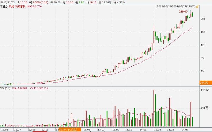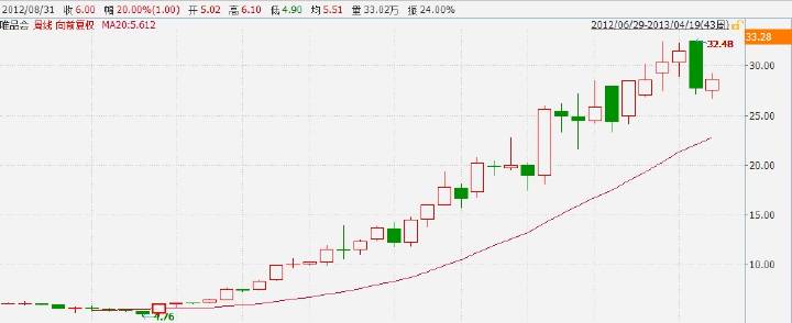 想必大家一定看过职业骑牛大赛吧。骑手必须骑在一头愤怒的公牛的牛背上,坚持时间最长的人才能获胜!场面惊心动魄,甚至有生命危险!非常的刺激! 虽然我们投资股票基本上不会有生命危险,但大部分投资者一生中也必定骑上过大牛股,享受过类似的刺激!但是据统计表明,真正骑上大牛股后能够坚持住,并获得百分之几百收益的人实在是少之又少。对于普通的个人投资者来说,这一生想通过投资股票来获得财务自由的话,那么必须能够骑上几只大牛股,并且能够坚持足够的时间来获得超高回报! 我们来到股市,不是仅仅为了寻求资产保值的。对于仅仅希望资产保值的投资者来说,股市的风险实在太大,还是去投资固定收益率的产品较好。来到股市,唯有想方设法取得高额回报,远超固定收益类产品才对得起我们面对的股市风险! 我见过大部分投资者,手中的股票一旦涨了20%~30%就开始心神不宁,害怕暴跌之后,原本可以拿到的盈利化为乌有,过早地卖出。相反,手里的股票一旦套牢,反而沉得住气拿得住股票,并不断补仓,以至于越套越深。也见过很多投资者,手里的本金在股市翻番后,就把本金全部取出,只留利润在股市中。庆幸自己再也不会在股市中受到损失了,但后来发现持有的股票又翻了一翻而懊恼不已!必须记住,你骑上了大牛,由于过早地卖出,错失了原本属于你的那份收益的话,就是损失! 面对股市,我们不应该有以上稍微赚了一点盈利,就消极打退堂鼓的念头。而是应该不断地积极进取,扩大战果!特别是在牛市中,更应如此。 一旦我的持仓股大大脱离了我的成本区,我就认为当初的选股逻辑是正确的。继续耐心等待估值的提升即可。一方面企业不断地高速成长能提升估值,另一方面市场的泡沫也会使估值提升得更厉害。这就是传说中的戴维斯双击。 单纯地根据基本面分析的话,大多数情况下只能吃到一击,这就是很多价值投资者早早下车的重要原因。因为泡沫的产生往往使得股价相当高估,使得投资者的内心产生了恐惧。要知道,泡沫对估值的提升往往比企业内在成长对估值的提升作用更明显,更强大。一波牛市来临后,一两年内市场的平均市盈率往往有3倍以上的增幅。有多少企业的业绩在一两年内可以增长3倍的呢? 如果目前是全仓的情况下,泡沫来了更不要怕,应该庆幸才对!泡沫是那些空仓者的敌人!而不是满仓者的! 很多投资者在牛市中赚了几倍,以为自己很牛逼。一到熊市,泡沫退去后,发现自己仍然没赚钱。就算是基本面分析很牛的投资者,一样逃不掉。因为,大部分人永远是搞不清楚赚的到底是基本面的钱还是泡沫的钱。。。 我可以这样说,对于大部分散户来说,满仓杀进杀出一年赚个30%。其实你根本说不清,这个投资者赚的到底是基本面的钱,还是赚的市场波动的钱。一年内,绝大部分的股票有个30%的市场波动是非常正常的。散户的资金量赚这点收益,基本都是莫名其妙地赚钱!除非你能长期稳定。但,如果一两年内,长线持股能获得百分之几百的收益,我断定是赚到了戴维斯双击的钱!必须是双击,而不是提前下车只赚到一击。比如我之前长线持有的掌趣科技和目前仍然持有的网宿科技,Buy-Hold(买入-持有),中途不做任何卖出操作。可能很多人觉得估值高了,应该抛了。但是我仍然很享受,为什么? 1、因为企业内在的增长可能化解泡沫。 2、泡沫可能会来得更猛烈! 那么这种情况下,我何必要卖出呢? 影响股价的那么多因,全部量化是不可能的!而且这些因,也不一定能结成果。那么,还不如把注意力放到果上面来。我追求大道至简,把最终能获得多少收益落在解决回撤上,就完全可以自由享受Buy-Hold的利润。所以,在我的系统中,回撤是至关重要的,不然就是坐电梯损失全部收益,要么就是赚到戴维斯一击的利润。想获得大约70%~80%的戴维斯双击的利润,请先和我一起看几张图! 这是一张唯品会2012年6月份(上市第三个月)至2013年4月份的周线图。 请告诉我,如果你当时5刀多买入唯品会,你会持有到多少钱卖出?你一定会说200刀吧,哈哈!那是因为现在人人都知道唯品会是大牛股,时光倒流的话,你一定不会卖出。但是,我们任何人在做一笔买入操作的时候,都不能100%确定这只股票一定是未来的大牛股。我们只是做了很多基本面的假设而已,如果这些假设都实现,那么可能会是一只大牛股。但是在你买入的那一刻开始,我们真的不知道股价一定会怎么走,都是很忐忑的。 12年6月份以5刀多的价格买入唯品会,你很有可能7刀多就卖出了(因为已经涨了30%啦),或者在10刀就卖出了(因为已经翻番啦)。90%以上的人熬到了15刀的时候终于缴械投降,已经涨了200%了,实在是忍不住了,现在跌10%,就相当于本金跌30%啊!熬不住熬不住,卖出获利了解,让自己平静吧。没有几个人可以熬到50刀,因为这个时候每向下调整10%,相当于跌掉当时自己的一份本金,心态已经变得极其浮躁,容易失控。所以,根据股价的涨幅多少来决定卖出是不合理的。 即使你是一个基本面分析的高手,你也会在唯品会从5刀涨到50刀这1000%的空间的任何一个地方卖出,因为根据基本面分析,总会发现股价有绝对高估的时候。所以,完全根据基本面情况来决定卖出也是不合理的。 那么有没有一种大道至简,傻子都能学会的卖出法则,并获得超高回报的方法呢? 答案是肯定的,而且极其的简单!我经过多年的检验、观察、并在我的模型中
